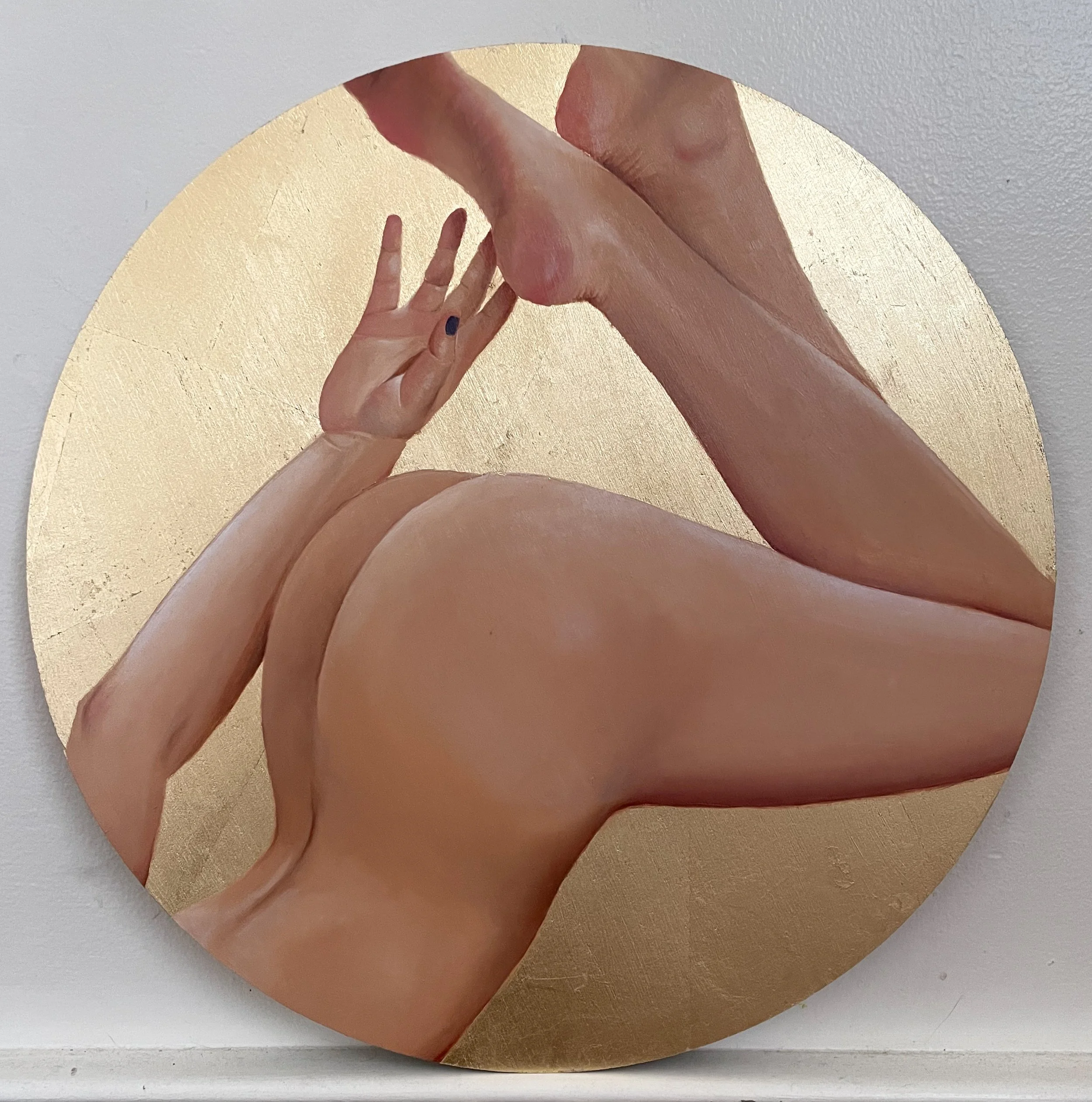 In the center of this piece, a female body kneels, her legs bending upward with an unmistakable sensuality. It is through her form that the artist invites us to explore the depths of our own desires and passions.